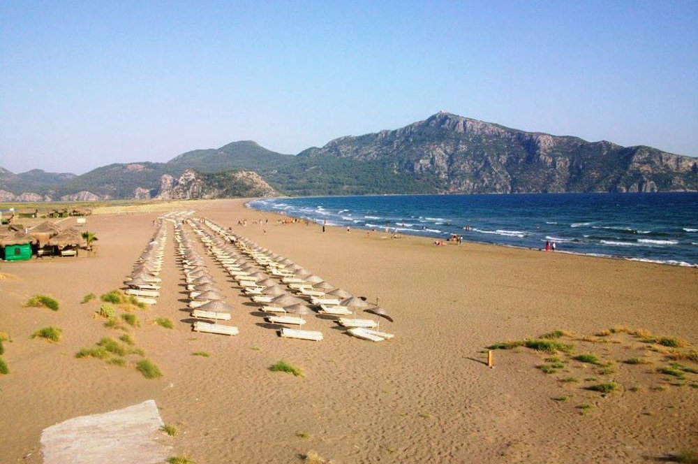 - Iztuzu Beach, which has become the symbol of Dalyan, is one of the places where local and foreign tourists want to enjoy the sea. In order to provide this experience to our guests, after visiting the Tombs of the Kings, a swimming break is given at Iztuzu Beach for 1 to 1 hour and 30 minutes. The beach has a different and important feature from other beaches. The beach is shaped like a coastal arrow extending into the sea, with salt water on one side and fresh water on the other. The 7.5 km long beach is approximately 12 km away from Dalyan center, but this distance may vary by boat tour. You will also have the opportunity to see the unique historical sites of Dalyan during the boat tour until you reach the beach. Additionally, thousands of Caretta Caretta turtles lay their eggs on this beach every year. To protect turtle eggs, entrances to the beach are closed between 20.00 and 8.00. If you join the boat tour during the spawning period of Caretta Carettas, you may have the opportunity to meet these special creatures.
